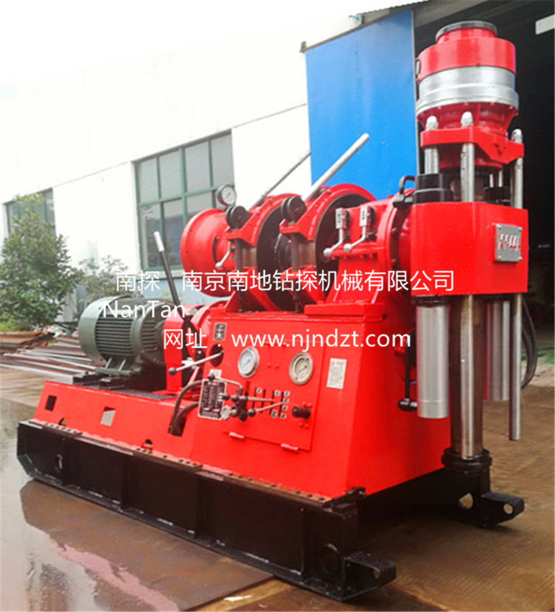 特點:具有較多的轉速級數(8級)和合理的轉速范圍,低速扭矩大(最大達3200牛頓·米),既適合以合金、金剛石巖心鉆進,也可用于工程地質勘察,水文水井鉆進和基礎樁工程施工。立軸通孔直徑大(直徑93毫米),雙軸缸液壓給進,行程較長(可達600毫米),工藝適應性強,特別適合大直徑鉆桿繩索取心(上部取心)鉆進,有利于提高鉆進效率和減少孔內事故。重量輕,可拆性好,鉆機凈重2300千克,主機可分解為10個部件(最大可拆部件重量300千克),搬遷方便,宜于山區(qū)工作。 液壓卡盤采用雙向供油并裝有液壓鎖,卡盤夾持力大,夾持穩(wěn)定。 配有水剎車,深孔鉆進,下鉆平穩(wěn)安全。采用單聯齒輪油泵供油,安裝簡單,方便使用,功率消耗少,液壓系統(tǒng)油溫低,工作穩(wěn)定。系統(tǒng)中裝有手搖油泵,當動力機不能工作時仍可用手搖油泵起出孔內鉆具。 鉆機結構緊湊,布局合理,所有部件表露在外,不相互重迭,便于維護、保養(yǎng)和修理。重心低,移車距離長(可達460毫米),固定牢靠,高速鉆進穩(wěn)定性好。 配有防震儀表,儀表壽命長,利于掌握孔內情況。操縱手把較少,操縱靈活可靠。通用化程度高,該機與XY-4型鉆機通用件達60%,與XY-42型鉆機通用件達75%。